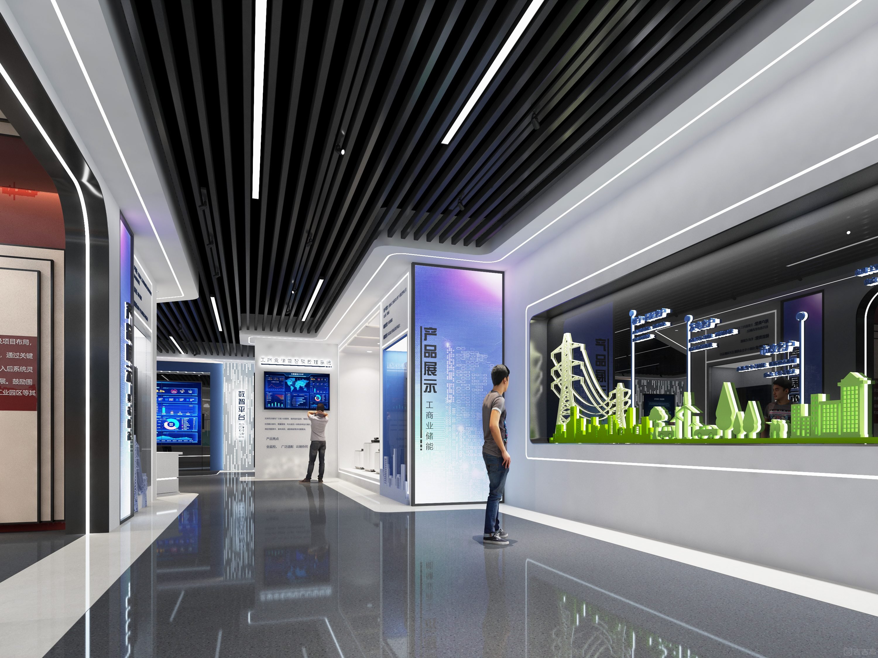 展廳充分結(jié)合“星能科技”標(biāo)準(zhǔn)色系,色調(diào)根據(jù)不同功能運(yùn)用,以藍(lán)色、白色為主,點(diǎn)綴紅色,打造科技感、現(xiàn)代感兼具的企業(yè)展示空間。展廳設(shè)計(jì)理念以“細(xì)胞膜”、“細(xì)胞核”、“細(xì)胞器”、“細(xì)胞質(zhì)”為主題對(duì)應(yīng)展示企業(yè)“電能系統(tǒng)”、“儲(chǔ)能系統(tǒng)”、“儲(chǔ)能設(shè)備”、“數(shù)智平臺(tái)”。